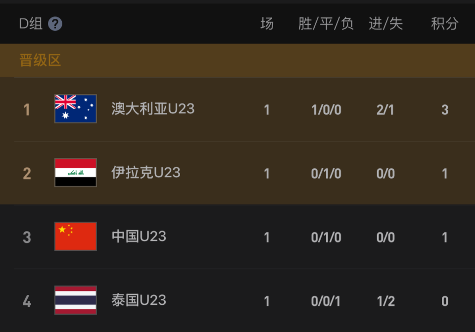 首轮战罢,澳大利亚队1胜积3分暂列榜首;U23国足和伊拉克都是1平积1分,并列积分榜第2位,泰国队1负积0分排名小组垫底。