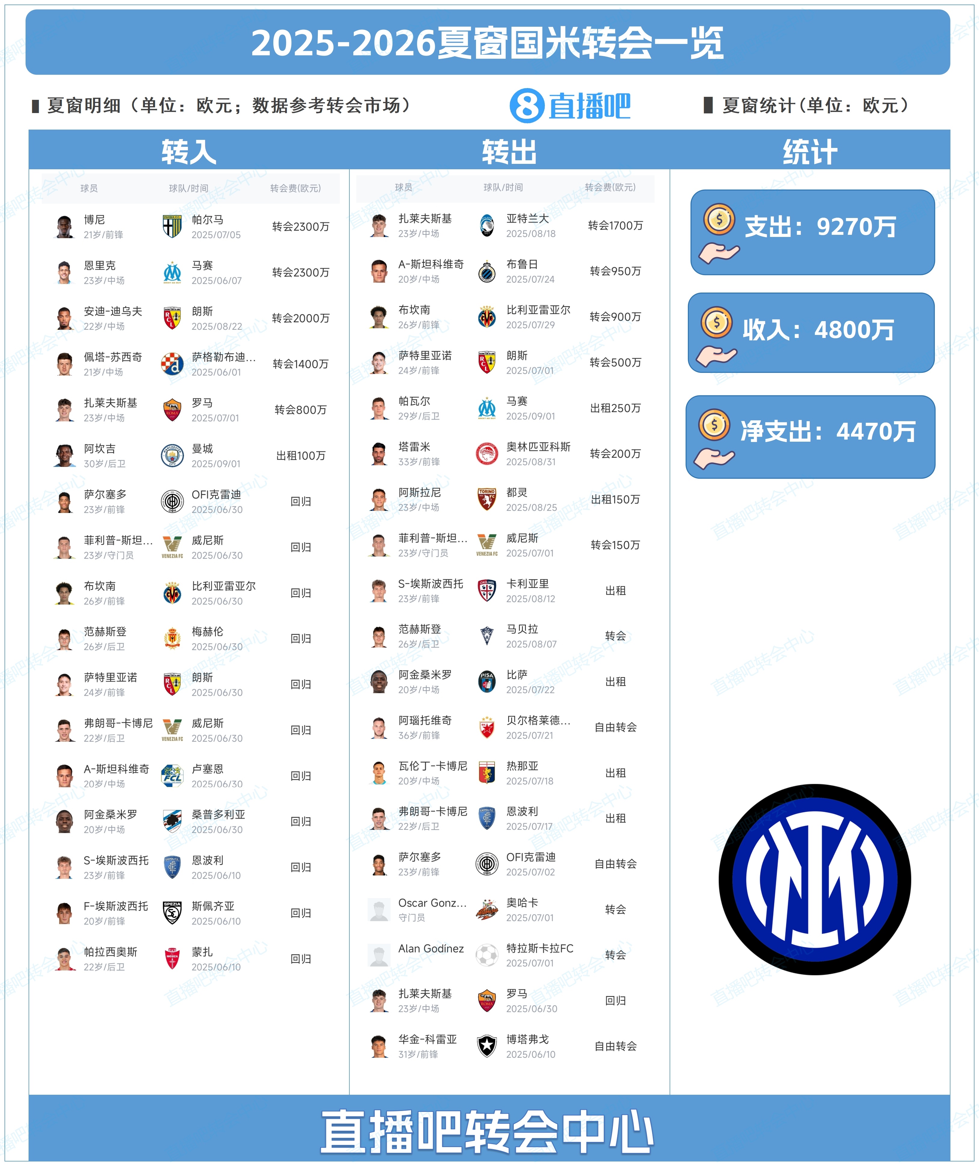为吧友们总结了国米今夏的转会操作,吧友们能打几分?