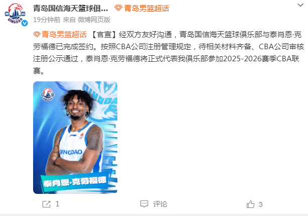 青岛男篮官方晒出泰肖恩-克劳福德加盟的海报,并且在公告写道:“经双方友好沟通,青岛国信海天篮球俱乐部与泰肖恩-克劳福德已完成签约。按照CBA公司注册管理规定,待相关材料齐备、CBA公司审核注册公示通过,泰肖恩-克劳福德将正式代表我俱乐部参加2025-2026赛季CBA联赛。
